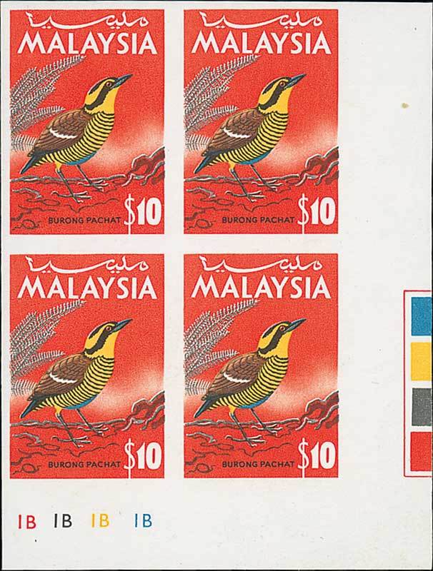 1965 (Sept.) Birds 25c. to $10 set of eight in imperforate blocks of four, the $10 from the lower right corner with plate numbers, fine unmounted mint. Photo for $10