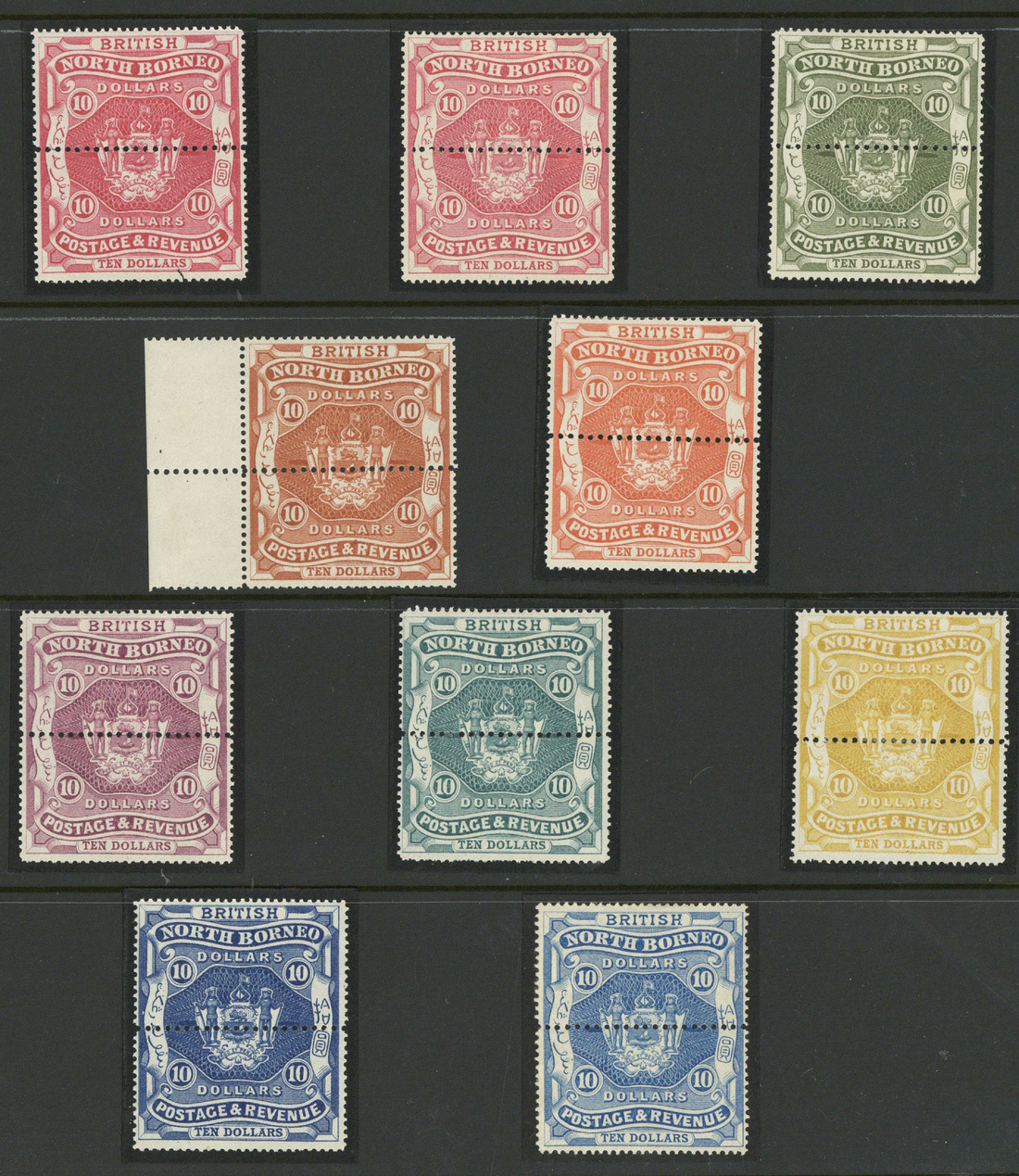 $10 (10) in different colours on gummed paper, each additionally perforated 12 across the centre, fresh and fine