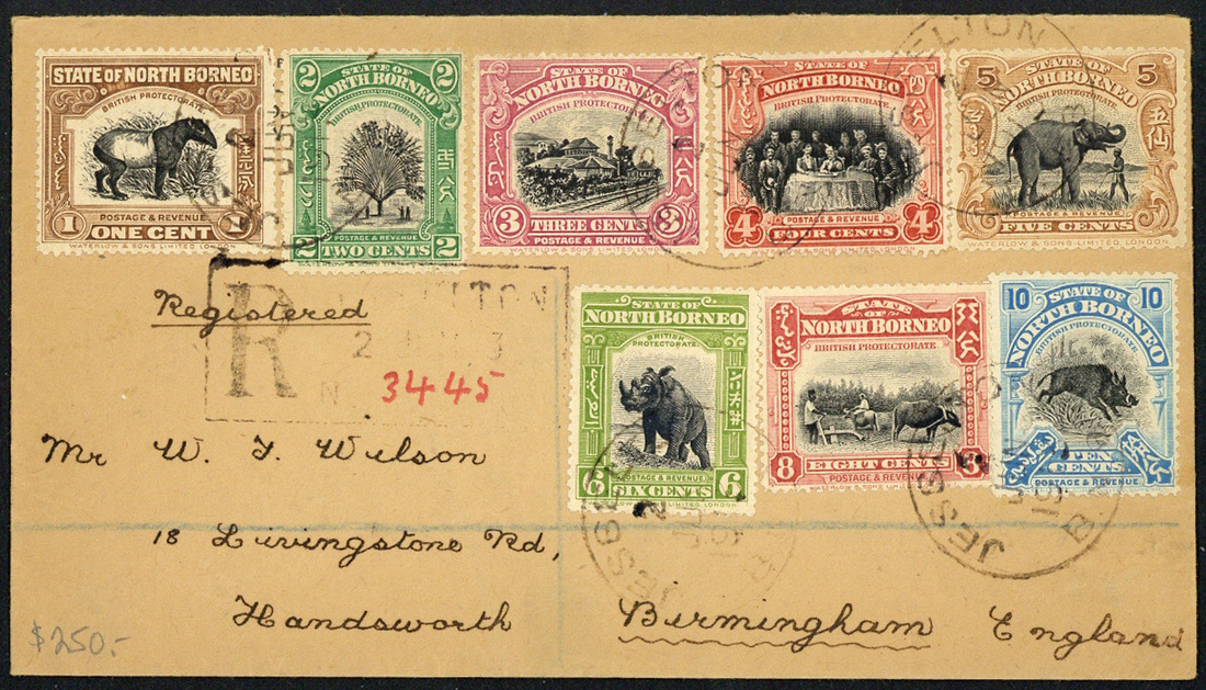 1913 (2 June) "Wilson" envelope registered to Birmingham, bearing 1909-22 Pictorial 1c., 2c., 3c. lake, 4c., 5c., 6c., 8c. and 10c., all tied by "jesselton/b.n.b." c.d.s., showing registration h.s. and, on reverse, London and arrival (7.6) datestamps. Colourful