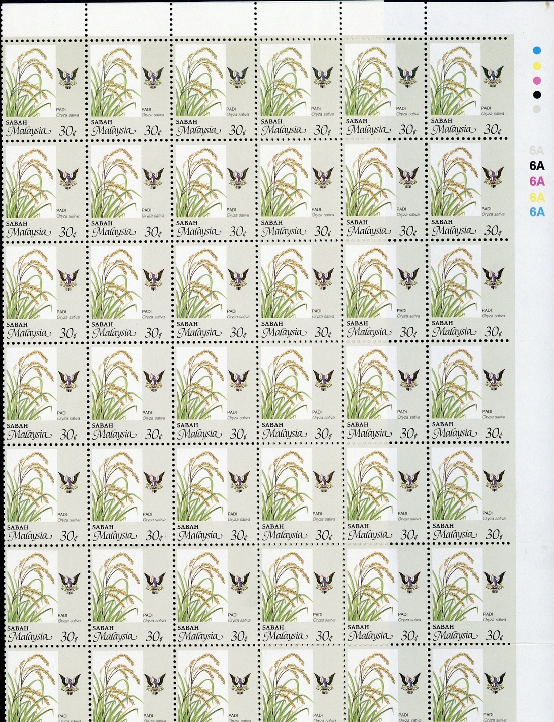1986 perf. 12 30c. Rice complete sheet of one hundred, the right-hand column variety imperforate between stamps and margin, unmounted mint; folded between columns 4 and 5, and rows 5 and 6. Scarce. S.G. 465 var.