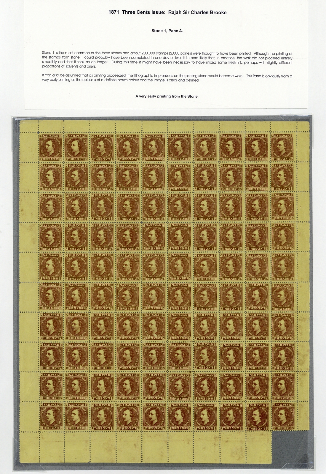 Stone 1, Pane A complete pane of one hundred from a very early printing with clear well-defined image in a definitive brown colour, [97] with stop after "three", unused without gum; margin missing below [100], a few thins towards centre, and a few light surface marks, mainly confined to margins