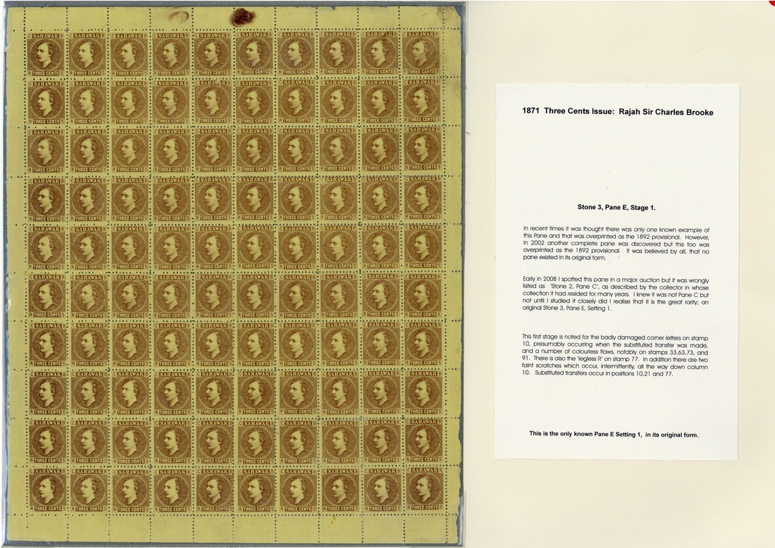 Stone 3, Pane E Setting 1 complete pane of one hundred, [10] with damaged corner letters, [10], [21] and [77] with substituted transfers, [33], [63], [73] and [91] with colourless flaws, [77] with legless "r", and column 10 with intermittent faint scratches, fresh unused without gum. The unique pane E in its original form, discovered in 2008