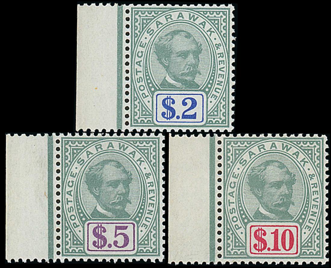 1888-97 prepared for use but not issued $2, $5 and $10, all with margin at left, fresh and fine unmounted mint. S.G. 21a-21c, £3800. Photo
