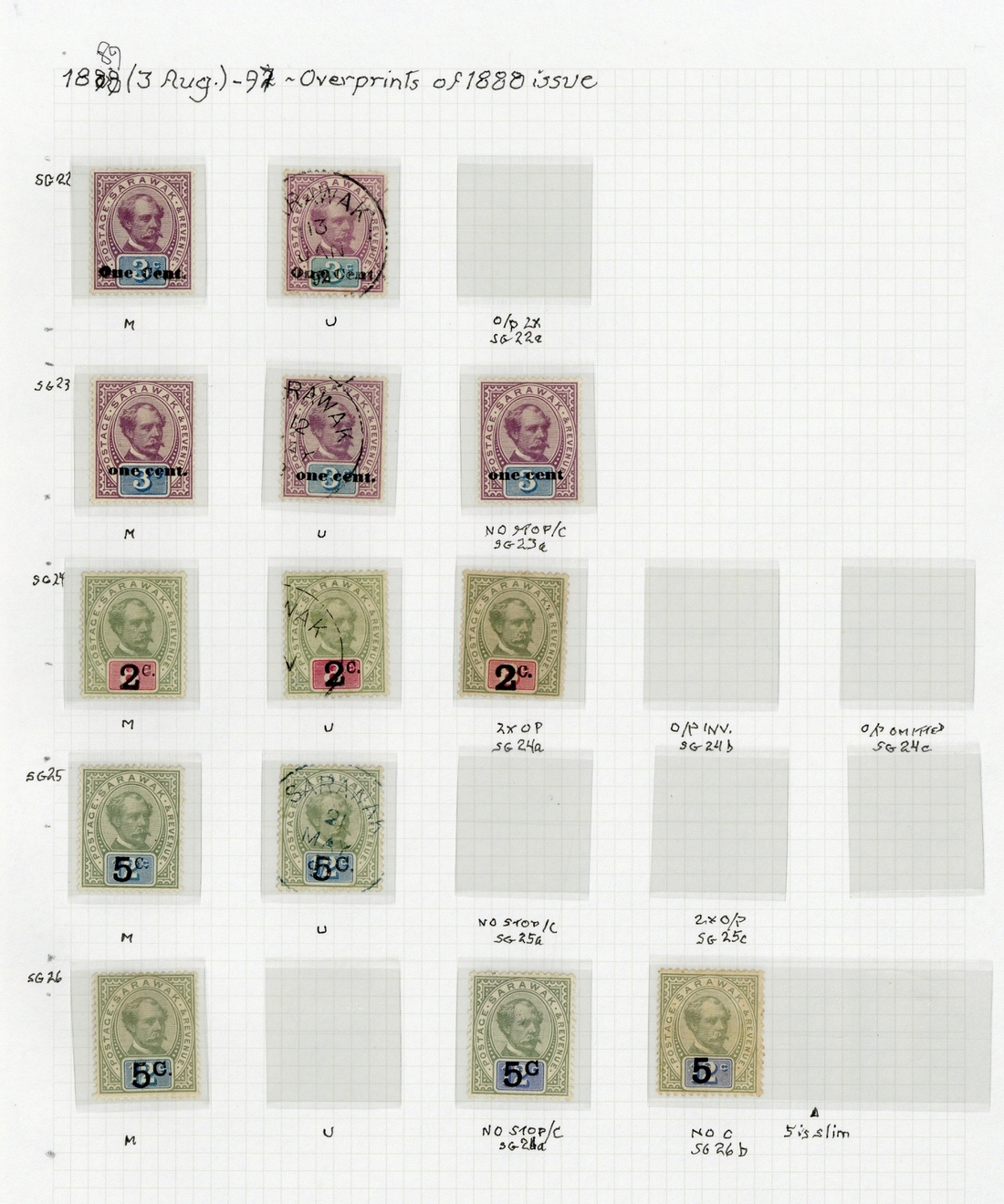 "One Cent" (Type 5) on 3c. mint and used, "one cent." (Type 6) on 3c. mint (3, one with no stop) and used, 2c. on 8c. mint (2, one with surcharge double - part original gum which is toned and heavy mount remainder - Brandon Certificate 2006), 5c. (Type 8) on 12c. mint (3) and 5c. (Type 9) on 12c. mint (3, one with no stop after "c" and one with "c" omitted - lightly toned) and used, good to fine. S.G. 22-26, £1800+
