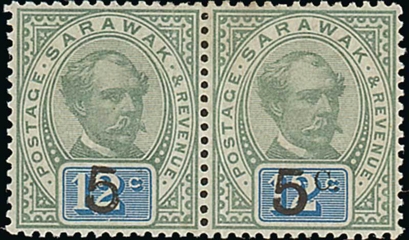 5c. (Type 8) on 12c. green and blue horizontal pair, the left-hand stamp showing variety "C" omitted in pair with normal, unused with large part original gum, the variety with vertical crease at right not affecting fine appearance. Scarce. S.G. 25c, £850. Photo