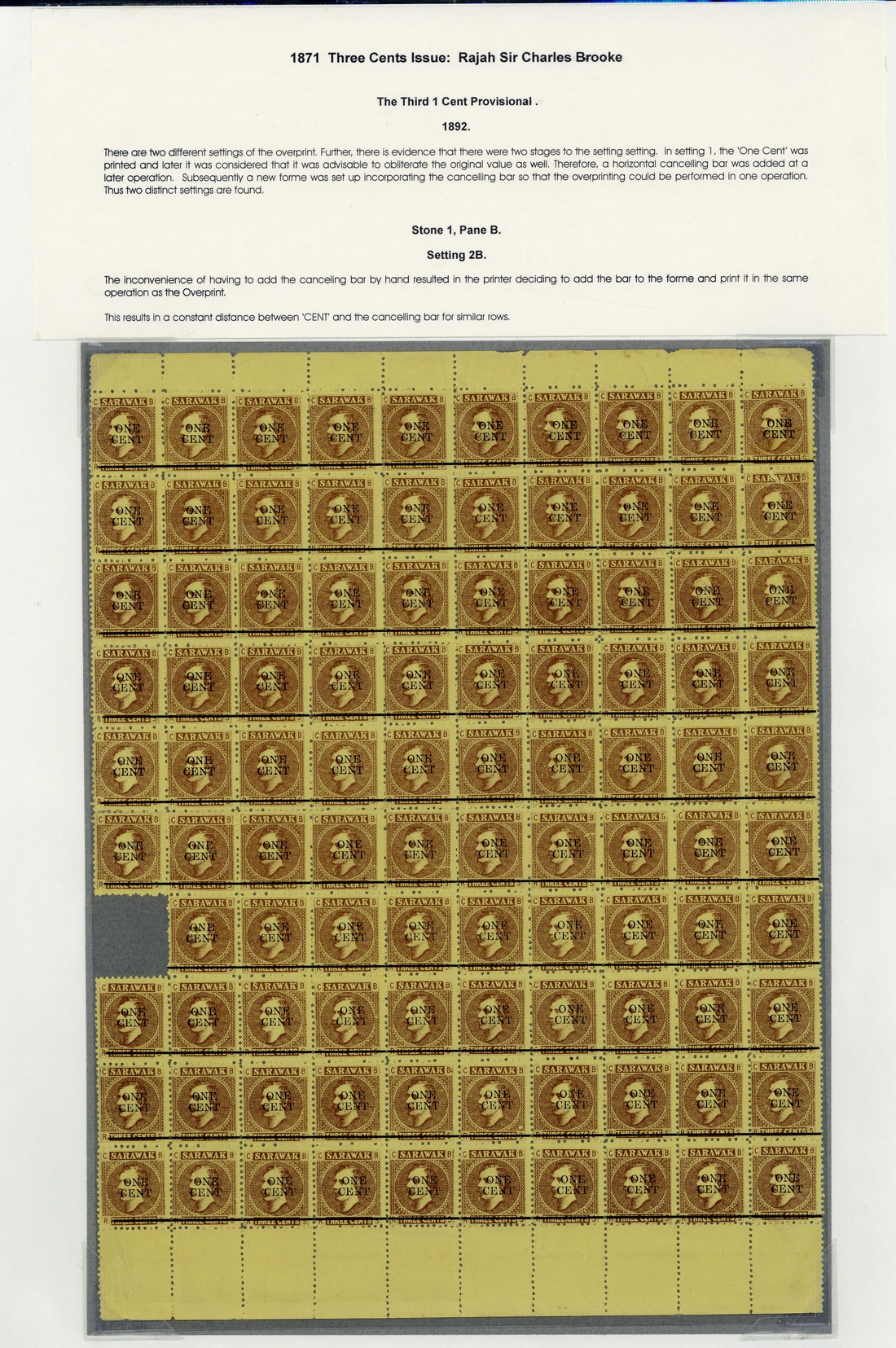 Stone 1, Pane B, Setting 2B complete pane of one hundred less [61], sheet margins at top and foot, cancelling bar added by printer, fresh unused without gum; [20] with surface faults at top, otherwise fine