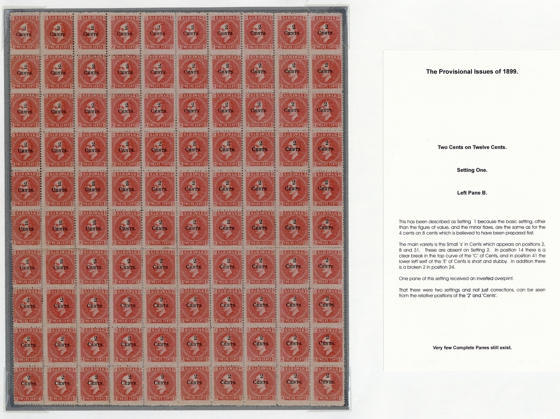 2c. on 12c. red on pale rose Setting 1, Pane B complete pane of one hundred without margins, [2], [8] and [31] with small "s" in "Cents" which is absent in Setting 2, fresh unused without gum; two with thins, otherwise fine. Rare with few panes still in existence