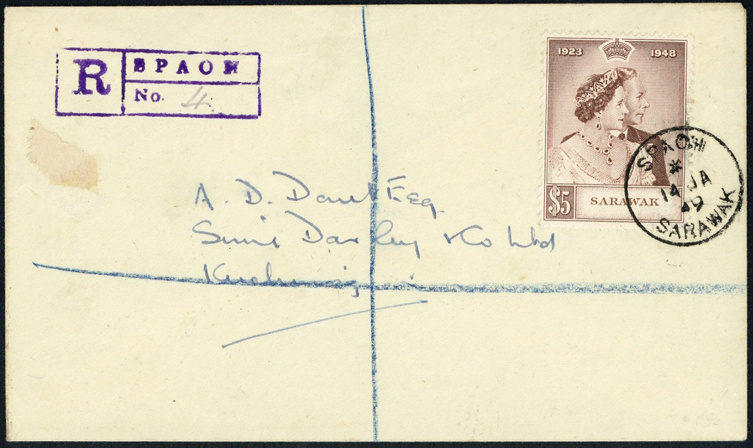 — $5 brown centrally cancelled by "spoah/sarawak" c.d.s. (Type D5) on 1949 (14 Jan.) envelope registered to Kuching, showing Type R4 registration h.s. (latest recorded date) with arrival c.d.s. on reverse