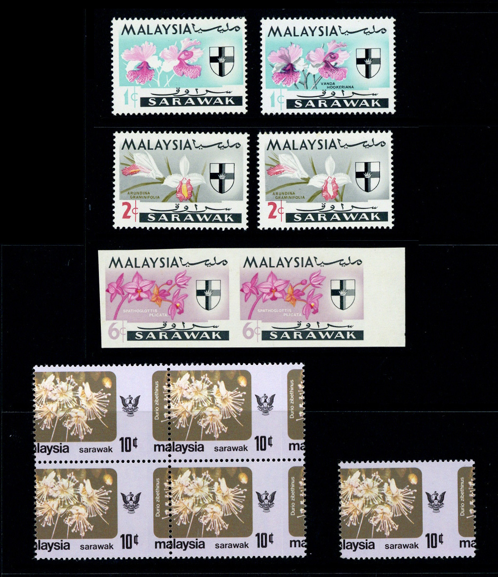 1965 Orchids 1c. with grey omitted, 2c. with yellow-olive (stems) omitted) and 6c. imperforate marginal horizontal pair, also 1979 Flowers 10c. block of four and single showing perforations misplaced 6mm. to right; fine unmounted mint