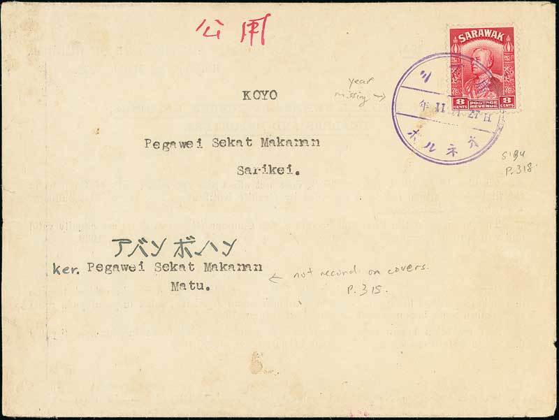 1942 (27 Nov.) homemade envelope from Matu to Sarikei, bearing unoverprinted 8c. carmine tied by Sibu Type JD1 datestamp in violet with year date missing. Rare. Photo