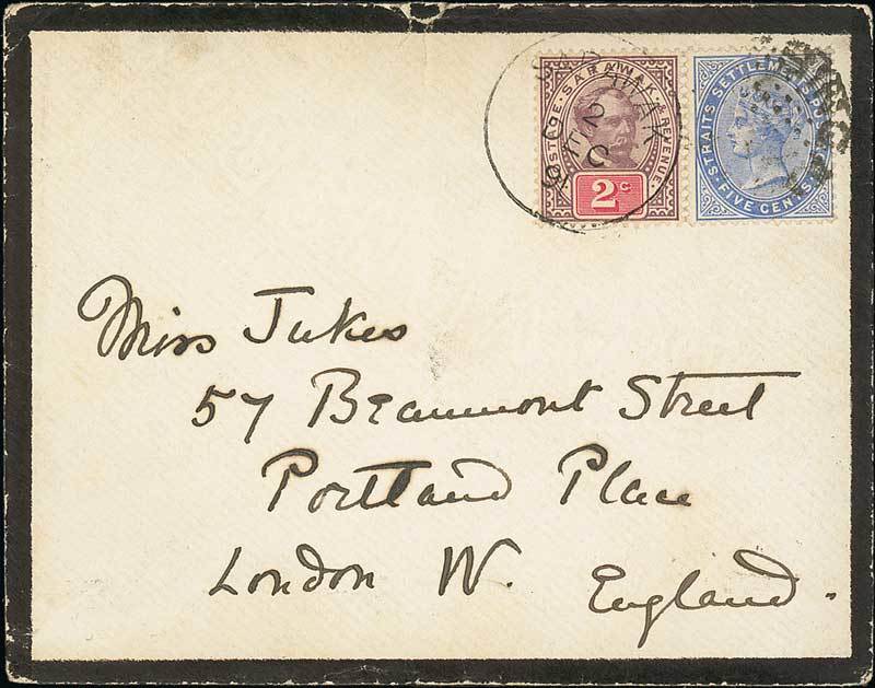 1891 (2 Dec.) mourning envelope to London, bearing 1889 2c. purple and carmine cancelled by 26mm. c.d.s. in combination with Straits Settlements 5c. blue cancelled with circle of dots and part Singapore dotted cancellation, the reverse (flap torn on opening) with Singapore (4.12) and London c.d.s. Photo