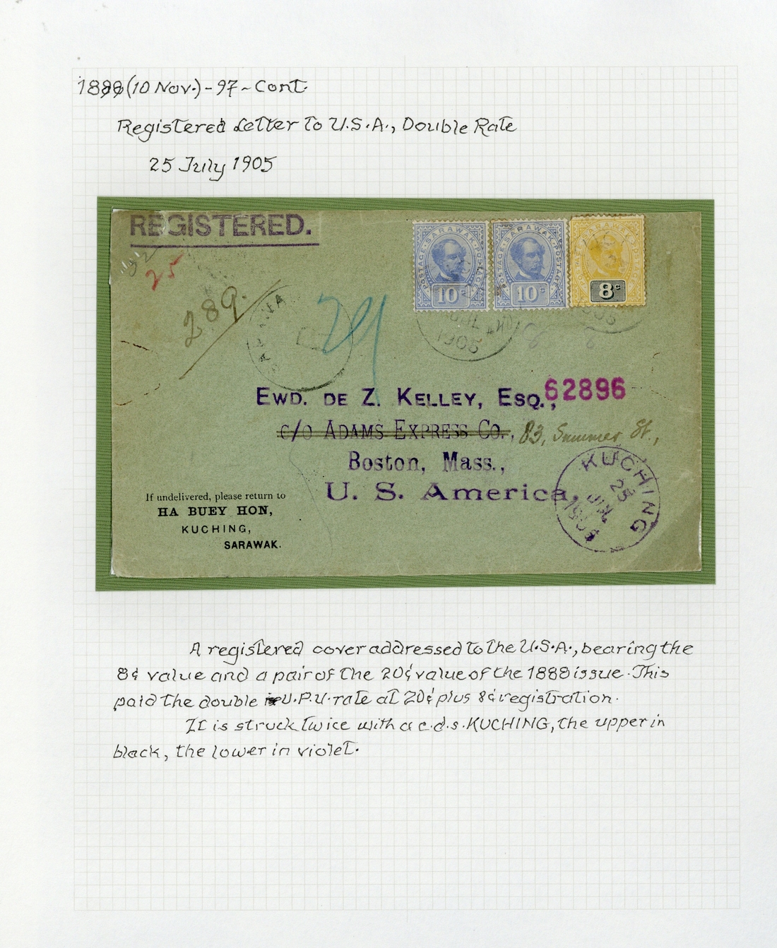 1905 (25 July) envelope registered to Boston USA, bearing 1899 8c. and 10c. (2), all tied by Kuching c.d.s., showing another strike below in violet and, on reverse, London (19.8) and arrival (30.8) datestamps; the adhesives with some light staining to perf tips