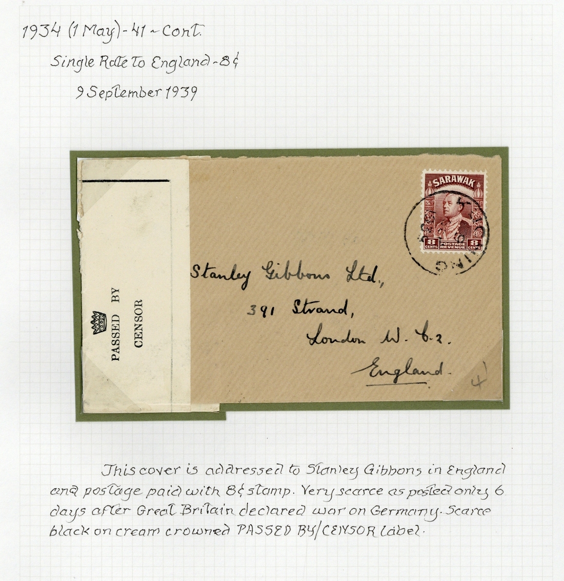 1939 (9 Sept.) envelope franked at 8c. and 1939 (3 Dec.) envelope franked at 55c., both from Kuching to London and showing censor label; 1939 (16 Dec.) envelope from Kuching to Scotland franked at 55c., 1940 (28 Mar.) envelope from Sibu to Wales franked at $1.10, 1940 (29 May) envelope from Miri to Chelmsford franked at 8c. and 1941 (27 Nov.) envelope from Miri to USA franked at 12c., each showing framed "passed by/censor" h.s., the last a smaller type
