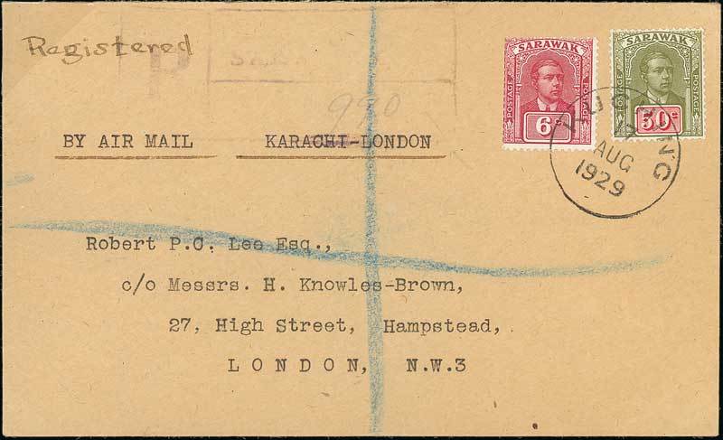 1929 (17 Aug.) "Lee" envelope registered from Kuching to London, marked "By Air Mail" and "Karachi - London" and franked at 56c., no backstamps. Rare, about 44 letters carried. Photo