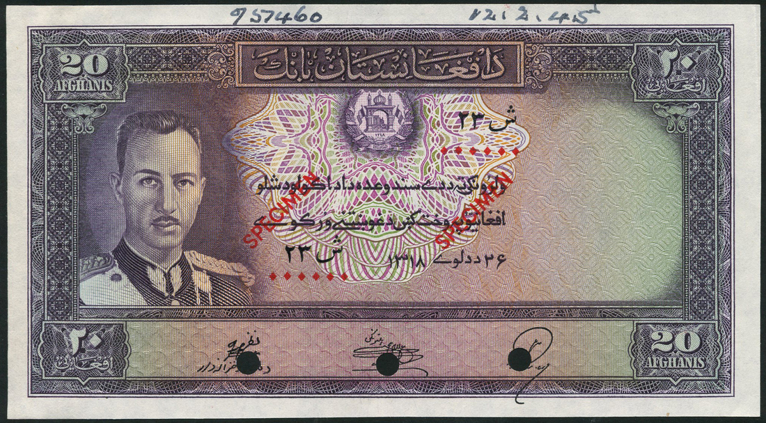(†) Da Afghanistan Bank, specimen 20 Afghanis, SH 1318 (1939), serial number 23SH 000000, violet on multicoloured underprint, King Muhammad Zahir at left, arms at upper centre, reverse river valley, overprinted SPECIMEN twice diagonally on obverse and once horizontally on reverse, three punch holes