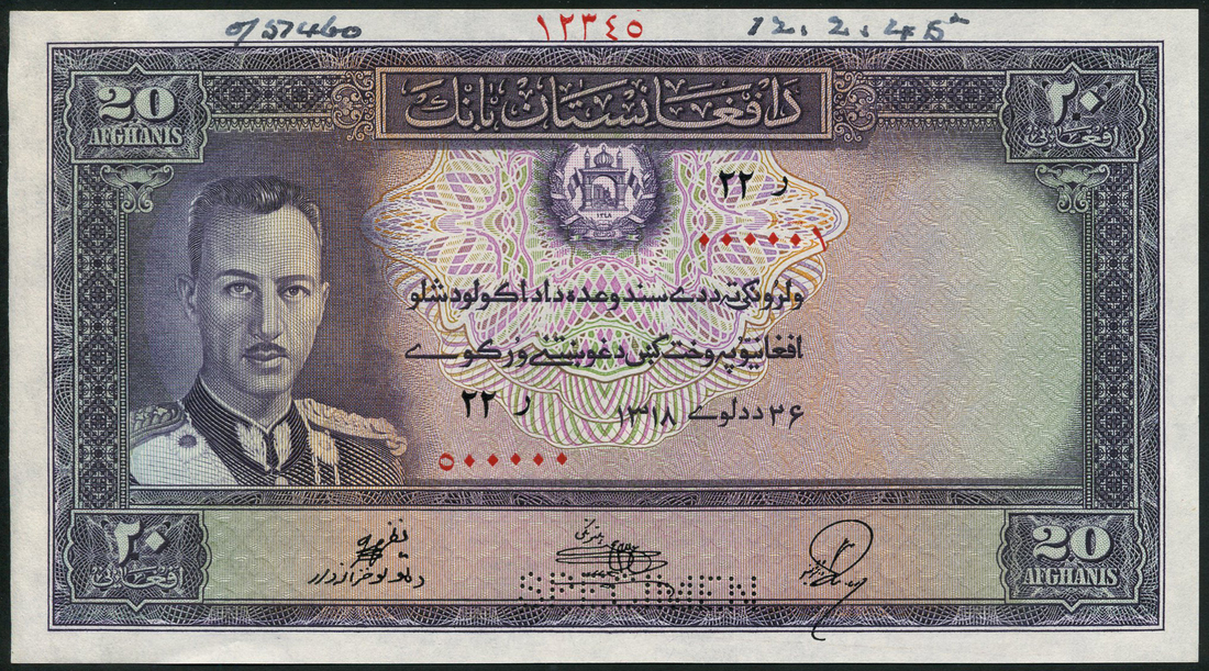 (†) Da Afghanistan Bank, printer's archival specimen 20 Afghanis (2), SH 1318 (1939), serial number runs 22R 000001 to 22R 500000 and 23SH 000001 to 23SH 500000, violet on multicoloured underprint, King Muhammad Zahir at left, arms at upper centre, reverse river valley, both perforated SPECIMEN