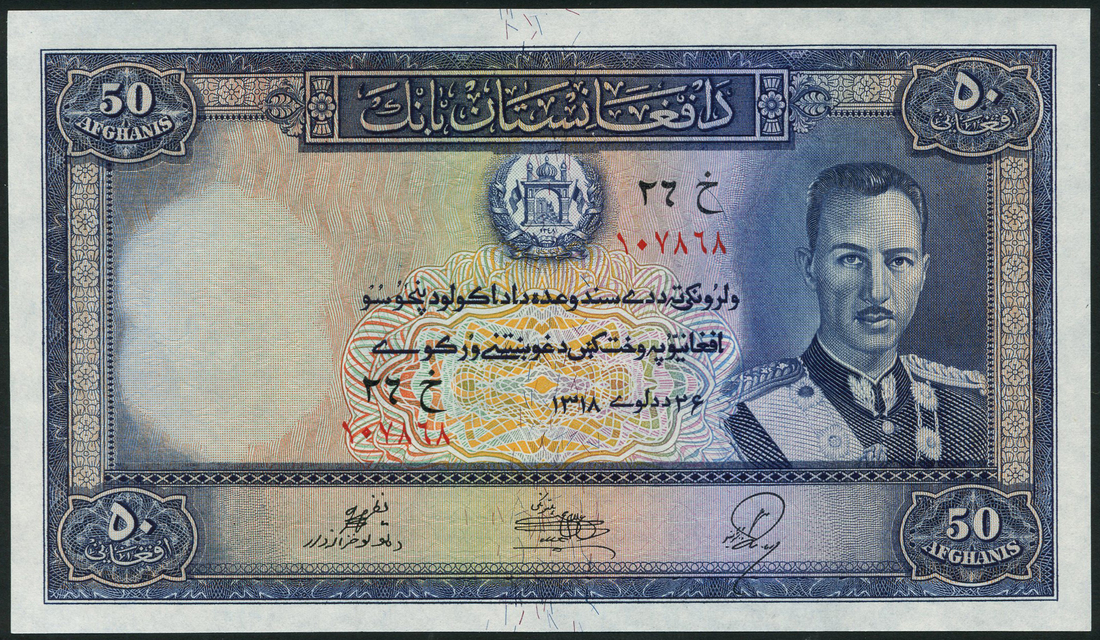 (x) Afghanistan Bank, 50 afghanis (2), 1939, serial numbers 107868 and 540759, blue on multicolour, arms at top centre, Mohammed Zahir at right,