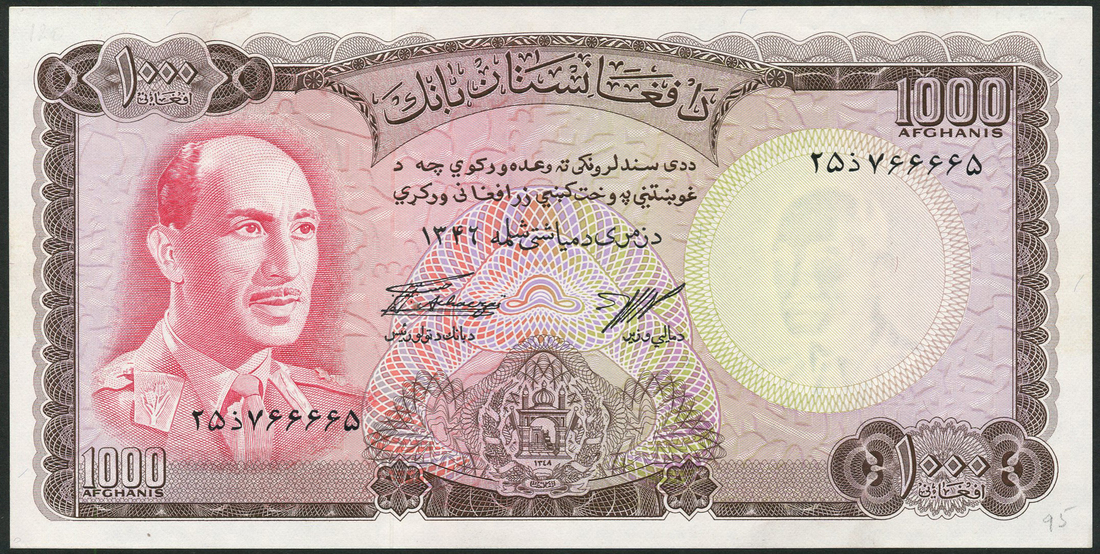 Afghanistan Bank, a group comprising 20, 10, 50 and 100 afghanis from the 1961 issue, 50, 100, 500 and 1000 afghanis from the 1967 issue, 10, 20 (3), 50 (2), 100, 500and 1000 afghanis from the 1973-1977 issue, 10, 20, 50, 100, 500 and 1000 afghanis form the 1979-1991 issue