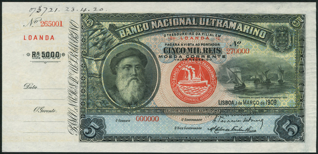 (†) Banco Nacional Ultramarino, Angola, printer's archival specimen 5 Mil Reis with counterfoil, 1 March 1909, serial number run 000000 to 270000, black on blue, green and yellow underprint, portrait of Vasco da Gama at left, passage of ships round The Cape of Good Hope at right, steamship seal Type III at centre, red overprint LOANDA at upper centre, reverse green, allegorical woman looking out at sailing ships, perforated SPECIMEN