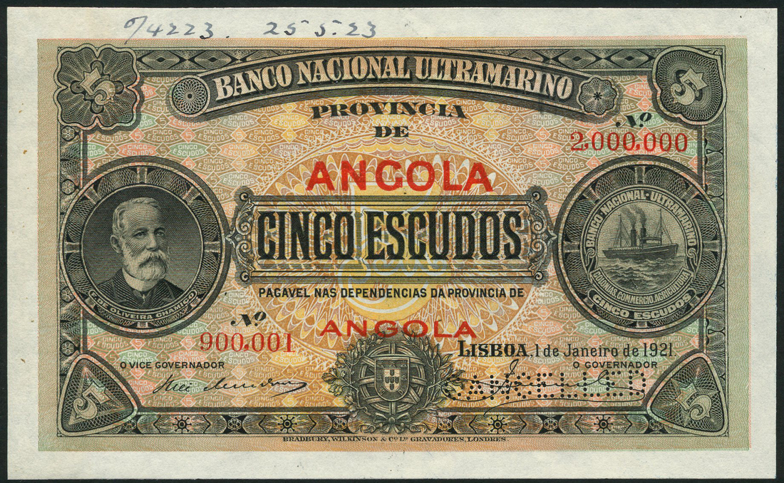 (†) Banco Nacional Ultramarino, Angola, printer's archival specimen 1 Escudo (2), 1 January 1921, both serial number run 3,150,001 to 6,000,000, green on multicoloured underprint; also 5 Escudos, 1 January 1921, serial number run 900,001 to 2,000,000, black on multicoloured underprint, all portrait of Francisco Oliveira de Chamico at left, steamship seal at right, arms at lower centre, value in each corner, reverse seated allegorical woman looking out at sailing ships, perforated CANCELLED