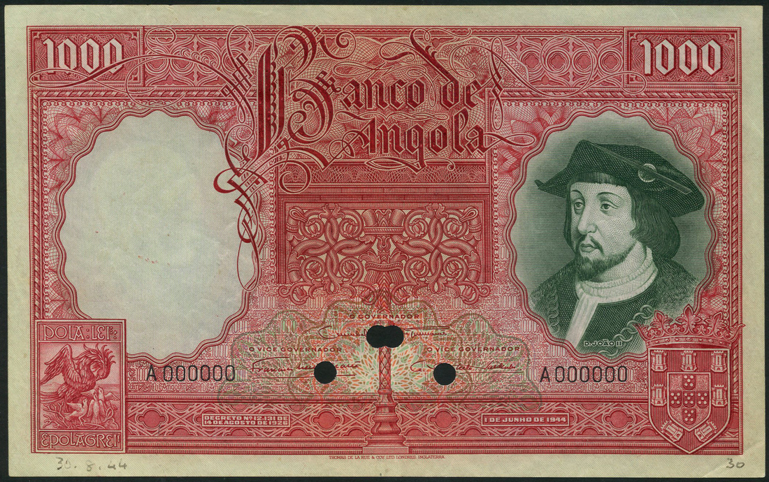 (x) Banco de Angola, specimen 1000 angolares, ND (1944), no serial numbers, red and green, King Joao II of Portugal at right, Eagle feeding her young with blood at low left, arms at low right, four cancellation holes