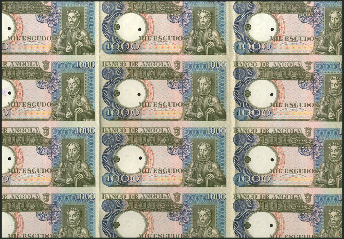 (x) Banco de Angola, an uncut complete control sheet 1000 Escudos (32), ND (21 Jun 974), no serial numbers, no signatures, olive and blue on multicoloured underprint, Luiz de Camoes at right, reverse waterfall, watermark Luiz de Camoes, one punch hole in each copy, colour bars in bottom margin