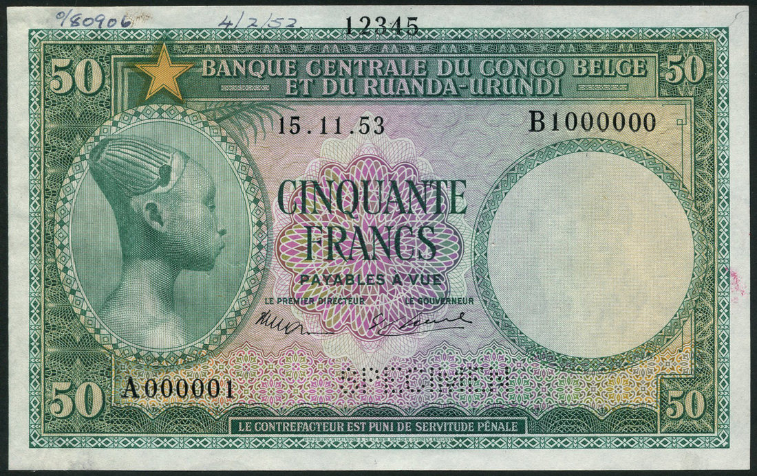 (†) Banque Centrale du Congo Belge et du Ruanda-Urundi, printer's archival specimen 50 Francs, 15 November 1953, serial number run A000001 to B1000000, green on multicoloured underprint, portrait of a woman in oval frame at left, value at centre and in each corner, reverse deep grey-green on pink underprint, two fisherwomen with large net, perforated SPECIMEN
