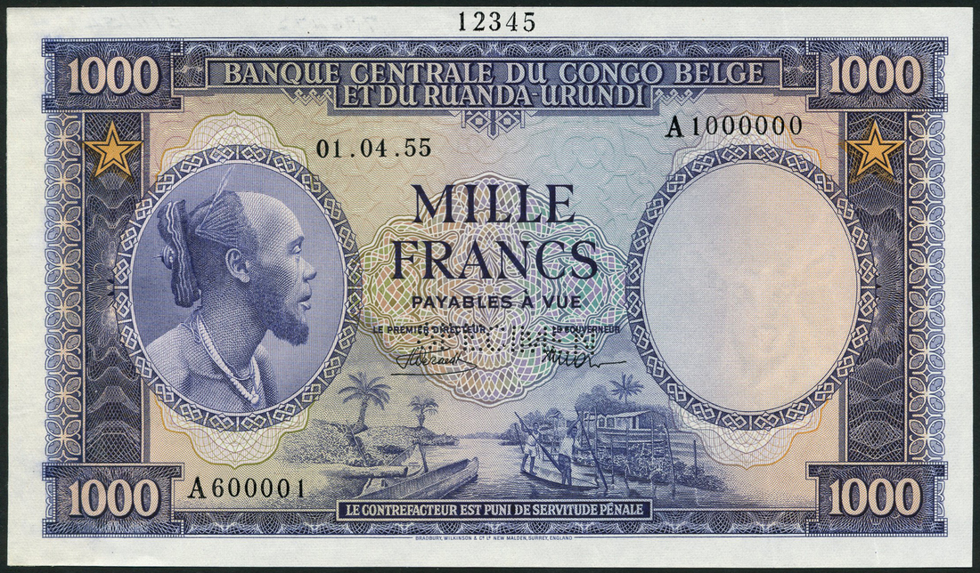 (†) Banque Centrale du Congo Belge et du Ruanda-Urundi, printer's archival specimen 1000 Francs, 1 April 1955, serial number run A600001 to A1000000, blue and multicoloured, portrait of a Moliro man in oval frame at left, value at centre and in each corner, reverse brown and grey on pink underprint, waterbuck drinking at centre, value in guilloche at right and at upper and lower left, perforated SPECIMEN