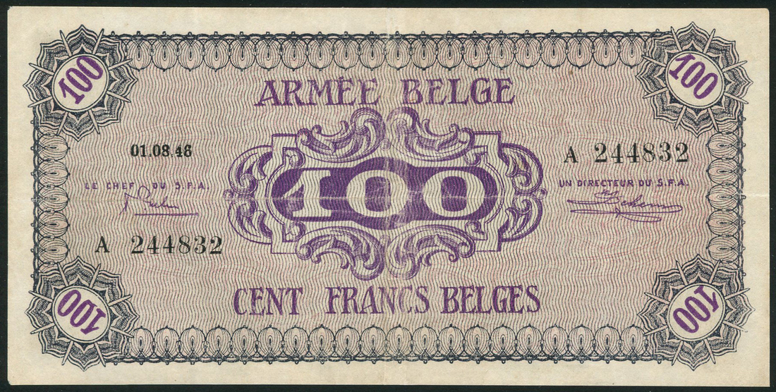 Belgium Army issue, 100 frank, 1 August 1946, serial number A 244832, violet and pale tan, value in violet guilloche at centre, value at each corner, reverse violet and tan, value in violet oval at left and right