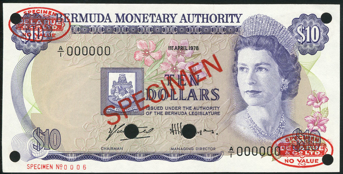 (†) Bermuda Monetary Authority, a group of specimens of the 1974-78 Issues, all serial number A/1 000000, Queen Elizabeth II in tiara at right, comprising $5, red-purple; $10, violet; $20, green; and $50, brown, all overprinted SPECIMEN diagonally in red with two De La Rue specimen ovals on obverse and reverse, two punch holes