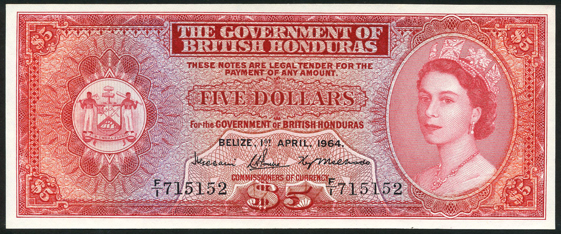 (x) Government of British Honduras, $5, 1 April 1964, serial number F/1 715152, red and lilac, portrait Queen Elizabeth II at right, arms at left, value in each corner and centre, ornate border, reverse, colourful guilloche pattern
