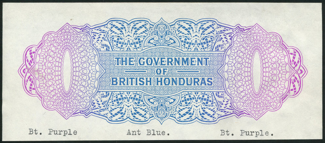 (†) Government of British Honduras, a progressive proof for $5, ND (1961), orange, mauve and brown underprint only, complete reverse red, blue and green, perforated CANCELLED; also reverse uniface colour die proofs, one blue-green and tan, the other blue and purple