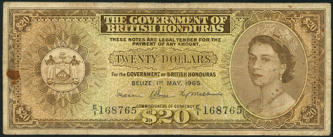 Government of British Honduras, $20, 1 May 1965, serial number E/1 168765, brown on green and brown underprint, Elizabeth II at right, arms at left, value at low centre and each corner