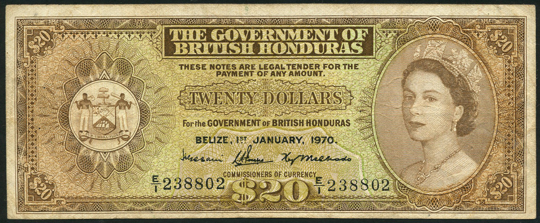 Government of British Honduras, $20, 1 January 1970, serial number E/1 238802, brown on green and brown underprint, Elizabeth II at right, arms at left, value at low centre and each corner