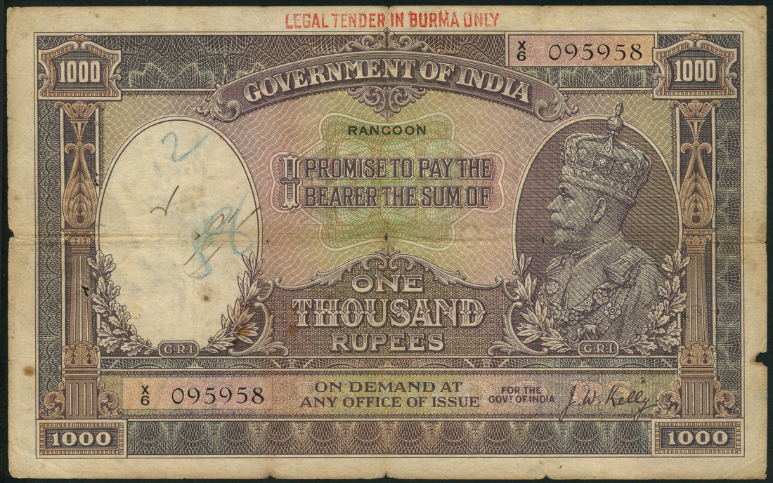 (x) Government of India, Burma, 1000 rupees, Rangoon, ND (1937), serial number X6 095958, brown and multicolour, portrait King George V at right ornate columns at left and right, reverse, oxen at centre with mountains and palm trees in background