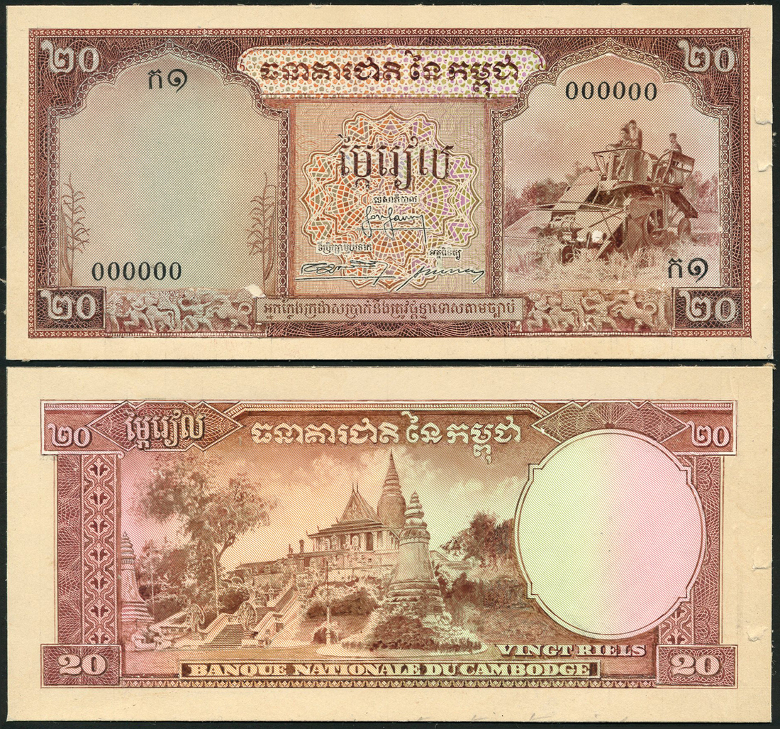 (†) Banque Nationale du Cambodge, an obverse and reverse composite essay on card for 20 Riels, ND (1955), serial number 000000, brown and multicoloured, combine harvester at right, carved frieze at lower left and right, reverse Phnom Penh pagoda