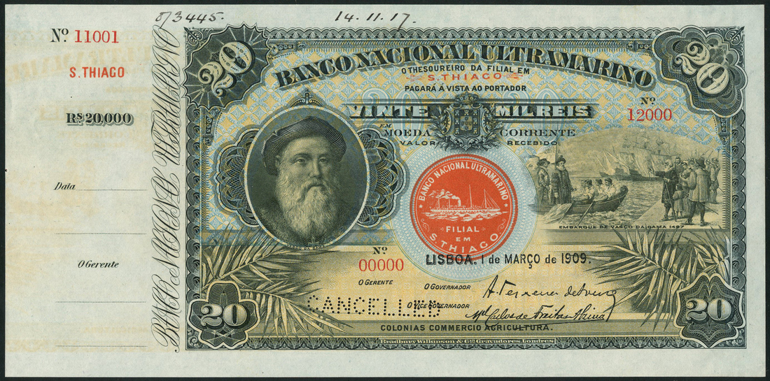 (†) Banco Nacional Ultramarino, Cape Verde, printer's archival specimen 20 Mil Reis with counterfoil, 1 March 1909, serial run 00000 to 12000, black on blue and yellow underprint, portrait of Vasco da Gama at left, his embarkation at right, steamship seal Type I at centre, red overprint S. THIAGO at upper centre, reverse orange-red, allegorical woman looking out at sailing ships, perforated CANCELLED