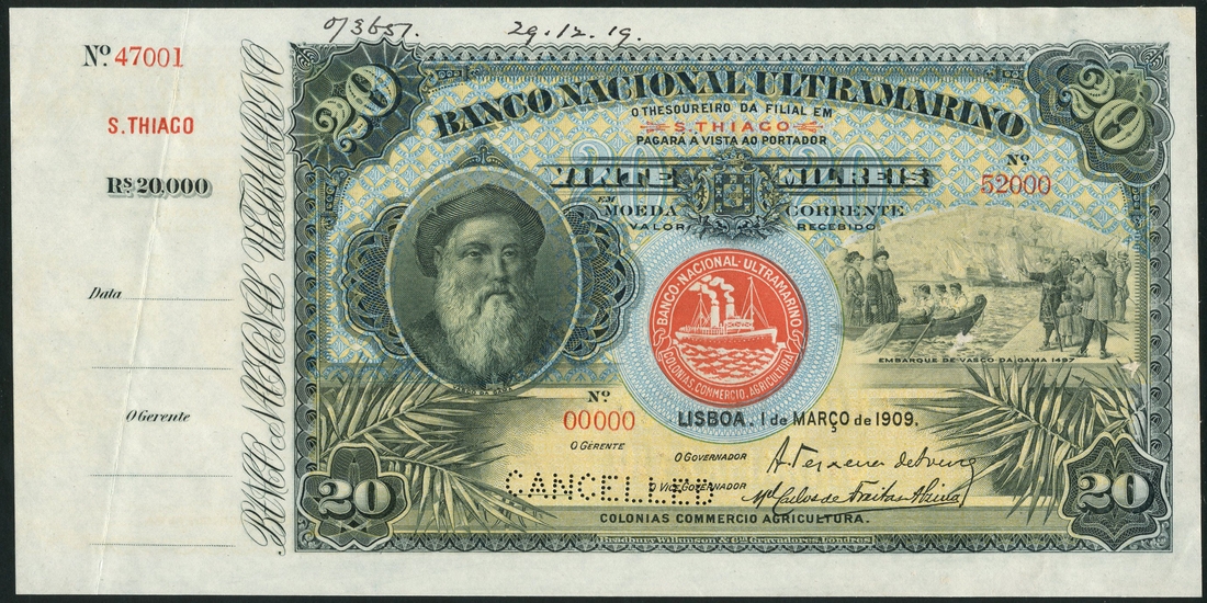 (†) Banco Nacional Ultramarino, Cape Verde, printer's archival specimen 20 Mil Reis with counterfoil, 1 March 1909, serial run 00000 to 52000, black on blue and yellow underprint, portrait of Vasco da Gama at left, his embarkation at right, steamship seal Type III at centre, red overprint S. THIAGO at upper centre, reverse orange-red, allegorical woman looking out at sailing ships, perforated CANCELLED