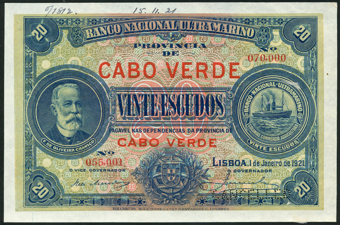 (†) Banco Nacional Ultramarino, Cape Verde, printer's archival specimen 20 Escudos (2), 1 January 1921, serial number runs 055,001 to 070,000 and 100,001 to 115,000, blue on multicoloured underprint, portrait of Francisco Oliveira de Chamico at left, steamship seal at right, arms at lower centre, value in each corner, reverse seated allegorical woman looking out at sailing ships, perforated CANCELLED