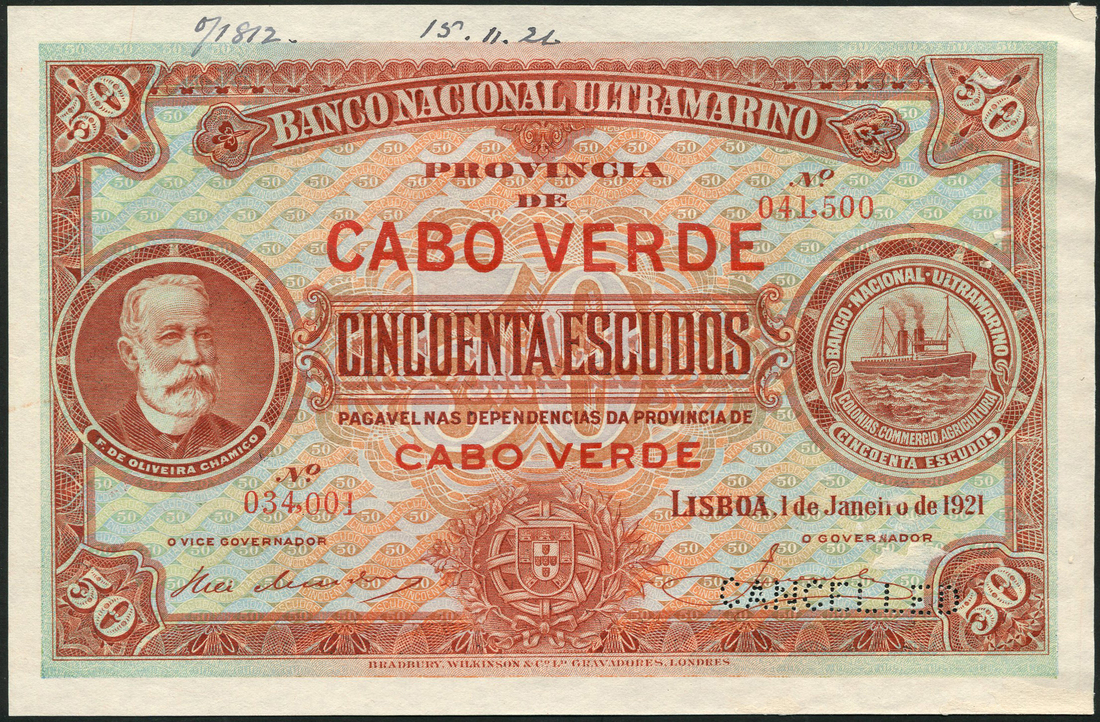 (†) Banco Nacional Ultramarino, Cape Verde, printer's archival specimen 50 Escudos, 1 January 1921, serial number run 034,001 to 41,500; also specimen proof 50 Escudos, 1 January 1921, no serial numbers, red-brown multicoloured underprint, both portrait of Francisco Oliveira de Chamico at left, steamship seal at right, arms at lower centre, value in each corner, reverse seated allegorical woman looking out at sailing ships, the first perforated CANCELLED, the second two punch holes