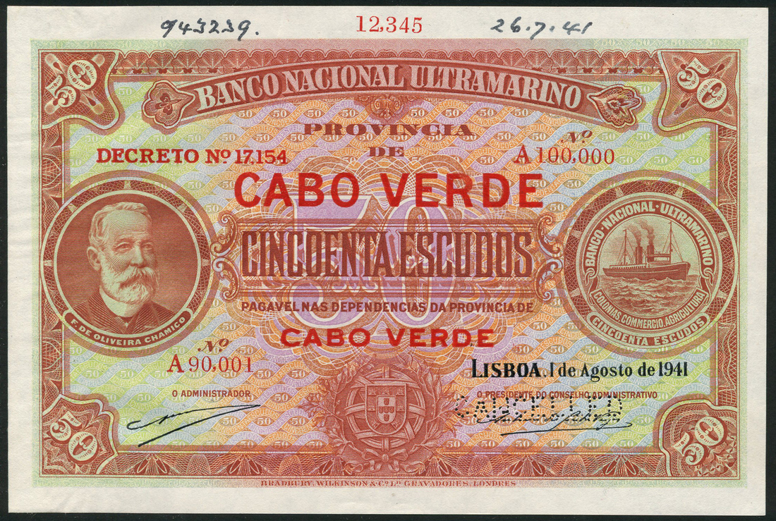 (†) Banco Nacional Ultramarino, Cape Verde, printer's archival specimen 50 Escudos, 1 August 1941, serial number run A90,001 to A100,000, orange-red on multicoloured underprint, portrait of Francisco Oliveira de Chamico at left, steamship seal at right, arms at lower centre, value in each corner, reverse seated allegorical woman looking out at sailing ships, perforated CANCELLED