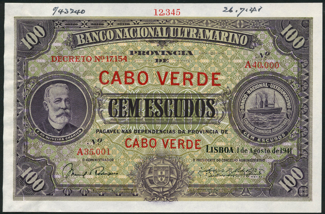 (†) Banco Nacional Ultramarino, Cape Verde, printer's archival specimen 100 Escudos (2), 1 August 1941, serial number runs A30,001 to A35,000 and A35,001 to A40,000, slate violet on multicoloured underprint, portrait of Francisco Oliveira de Chamico at left, steamship seal at right, arms at lower centre, value in each corner, reverse seated allegorical woman looking out at sailing ships, perforated CANCELLED