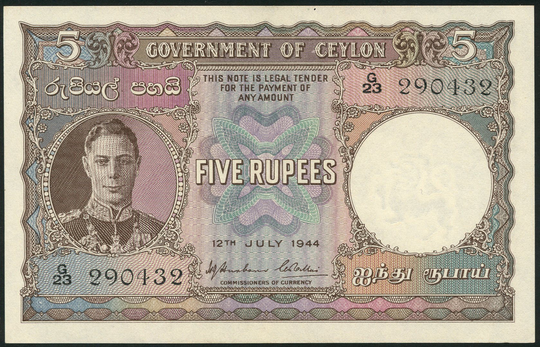 (x) Government of Ceylon, 5 rupees (2), 12 July 1944, consecutive serial numbers G23 290431-2, lilac and brown on multicolour underprint, portrait King George VI in ornate circular frame at left, reverse, Thuparama Dagoba, intricate columns at left and right