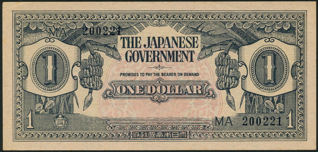 (x) Japanese Occupation, Malaya, $1, ND (1942), serial number MA 200221, dark blue and pink, bananas at left and right