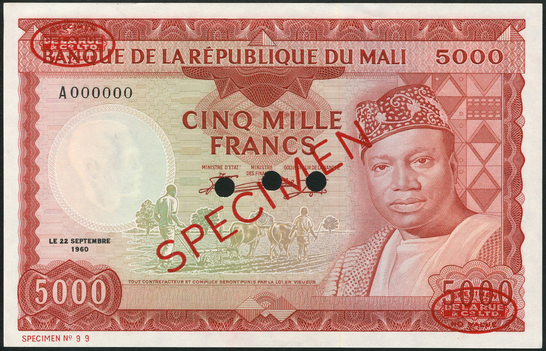 (†) Banque de la Republique du Mali, a set of specimens of the 22 September 1960 (1967) Second Issue, all Modibo Keita at right, all zero serials, comprising 50 Francs, prefix A, purple; 100 Francs, prefix A, brown; 500 Francs, prefix A, green; 1000 Francs, prefix J, blue; and 5000 Francs, prefix A, dark red, all overprinted SPECIMEN diagonally in red with two De La Rue specimen ovals on obverse and reverse, two or three punch holes
