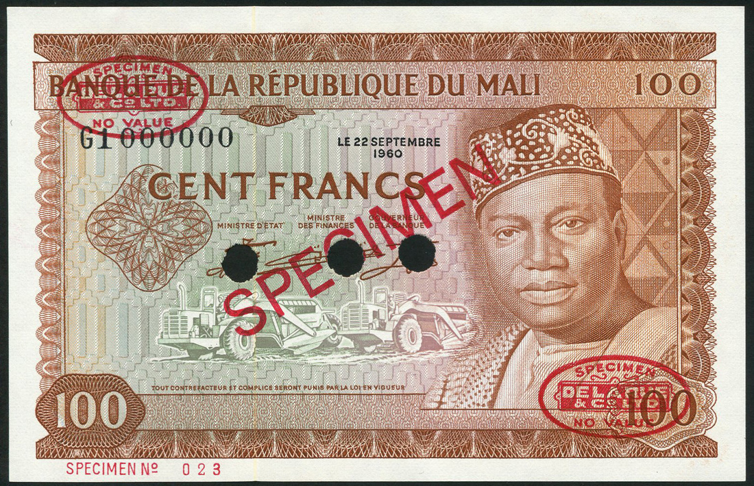 (†) Banque de la Republique du Mali, specimen 100 Francs (2), 22 September 1960 (1967) Second Issue, both serial number G1 000000, brown on pale green and lilac underprint, Modibo Keita at right, reverse longboat at centre, old man in turban at right, the first overprinted SPECIMEN diagonally in red with two De La Rue specimen ovals on obverse and reverse, three punch holes, the second perforated SPECIMEN