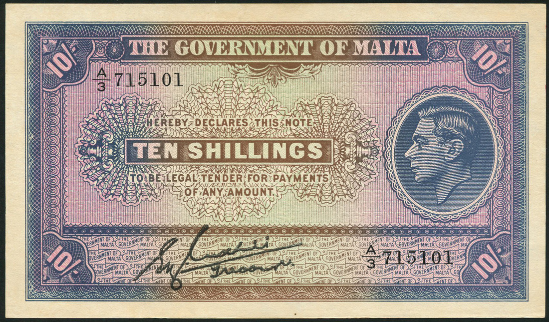 (x) Government of Malta, 10 shillings (2), ND (1940), serial numbers A/3 715070 and A/3 715101, uniface, blue, violet, light green and brown, portrait King George VI at right, value in each corner and at centre, bank title top centre