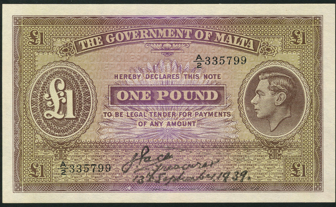 (x) Government of Malta, £1, ND (1940), serial number A/2 335799, uniface, brown and violet, portrait King George VI in circular frame at right, value in each corner, centre and in ornate tablet at left