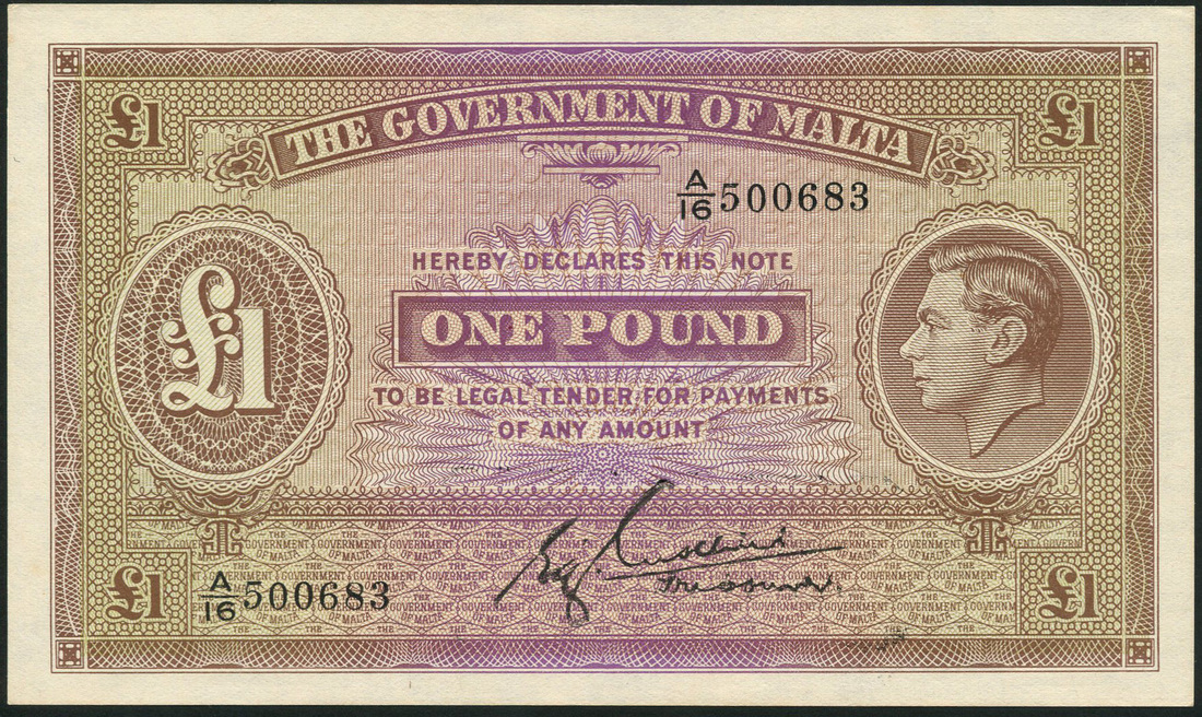 (x) Government of Malta, £1, ND, serial number A/16 500683, brown and violet, portrait King George VI at right, value in ornate frame at left and in each corner and in tablet at centre, bank title top centre
