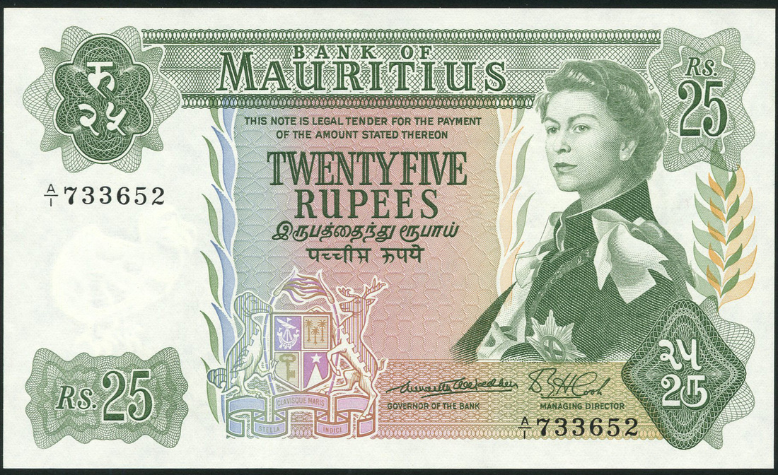(x) Bank of Mauritius, 25 rupees, ND, serial number A/1 733652, green and multicolour, Queen Elizabeth II at right, A. Beejadhur and D.G.H cook signatures